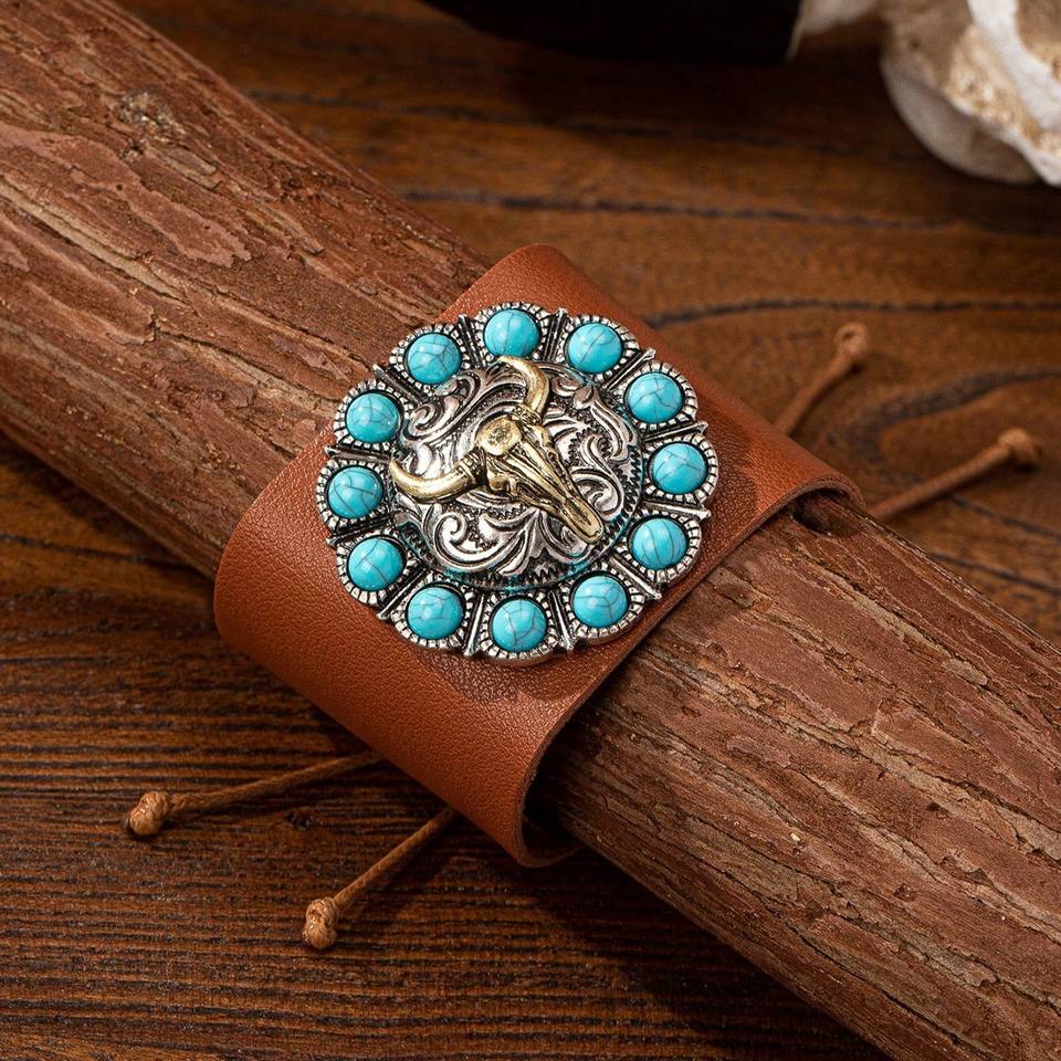 Bracelet coulissant en alliage de cuivre véritable, cuir, turquoise, perle d'imitation taille coussin, serti clos, style vintage western cowboy