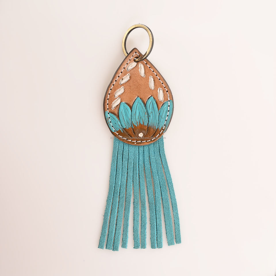 Porte-clés en cuir de vache véritable, style western, avec pompon et décorations de cowgirl