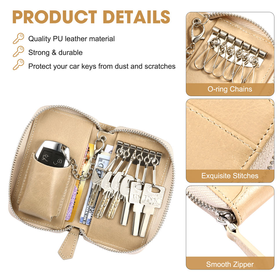 Étui porte-clés de voiture en cuir véritable, protège-clé intelligent, support d'entrée sans clé pour voiture avec crochet métallique et pochette zippée - Beige