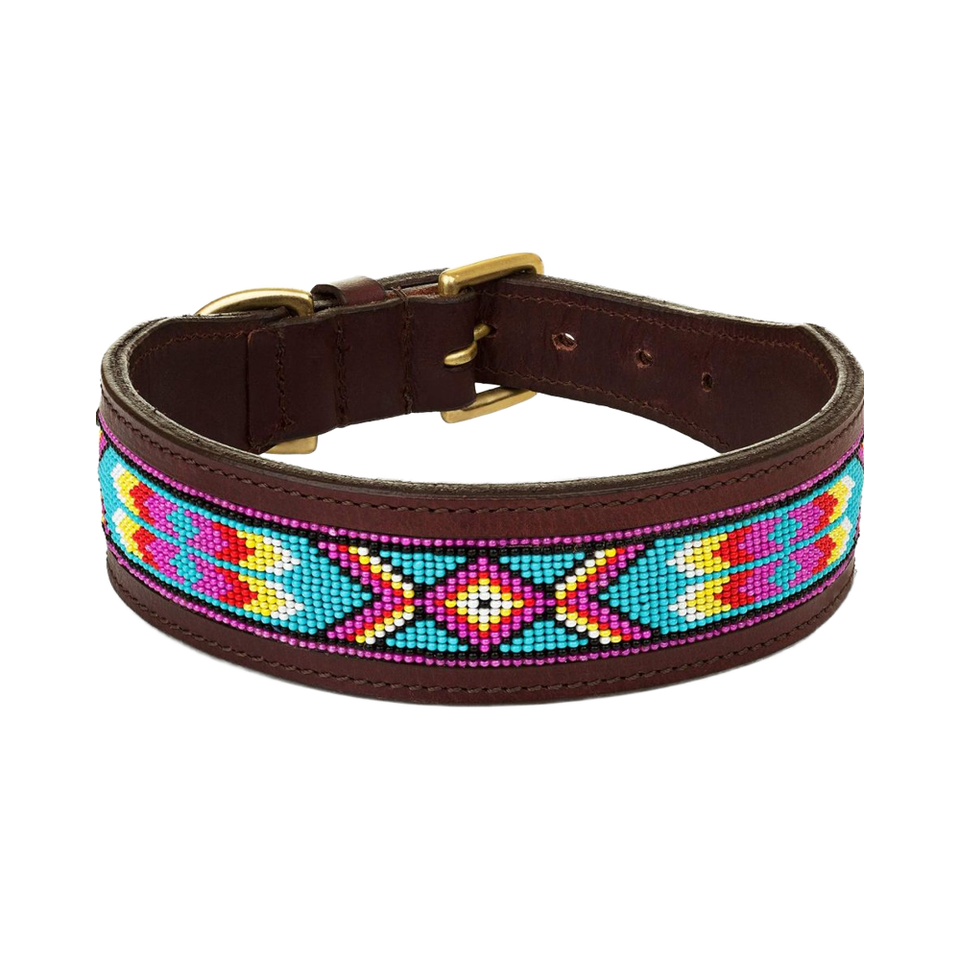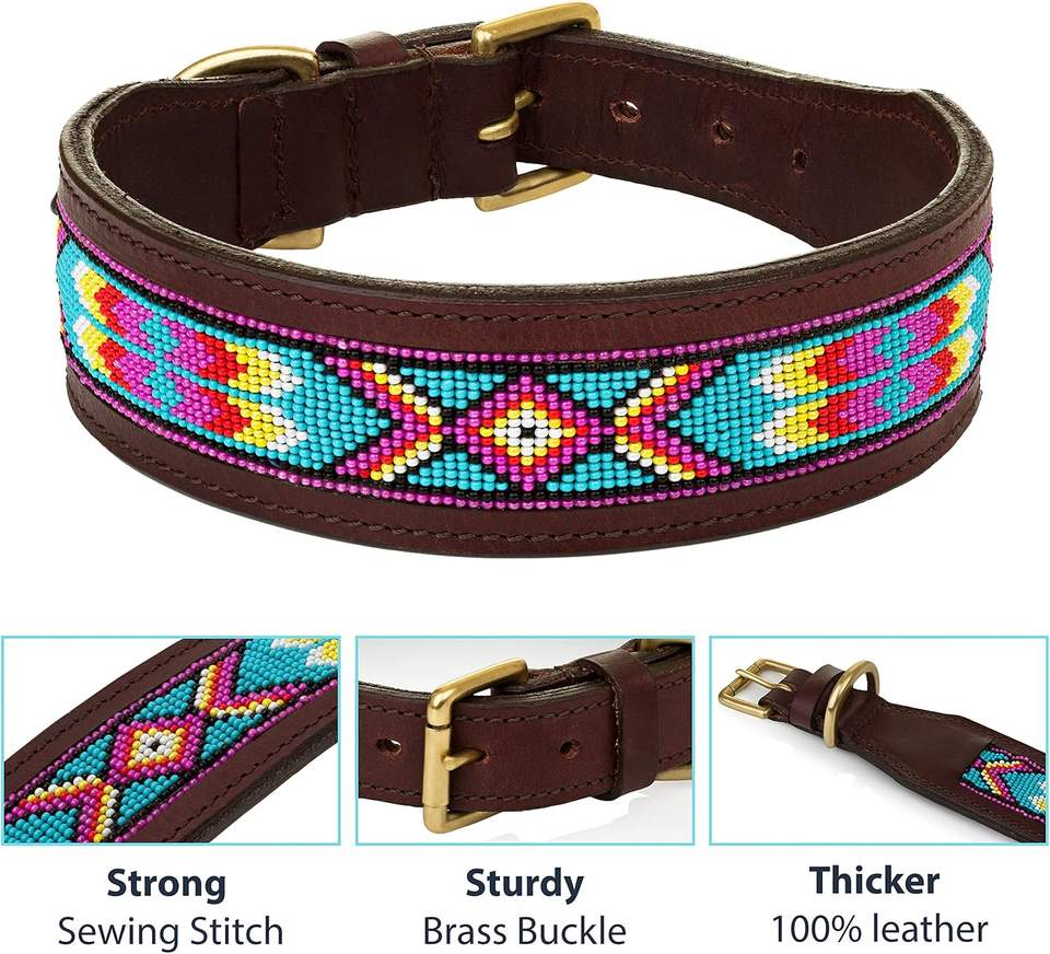 Collier de chien en cuir véritable avec motif perlé aztèque Boucle réglable faite à la main pour chiens moyens et grands