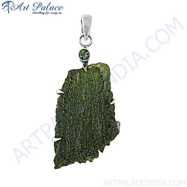 Genuine Moldavite & Tourmaline Gemstone Silver Pendant