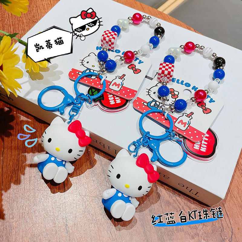 Porte-clés en chaîne de perles en plastique authentique, motif chat de dessin animé, pendentif exquis pour sac de fille