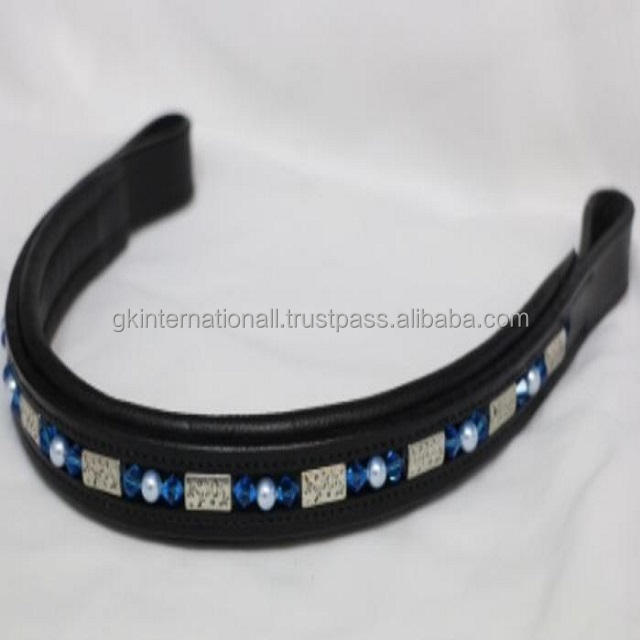 Bande de sourcils de cheval en cuir véritable noir, professionnel, premium, plat, avec perle bleue et chaîne de cristal, rembourré, doux