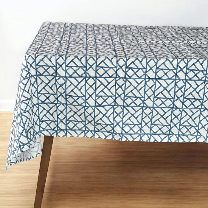 Nappe à motifs géométriques, bleu et blanc, motif en treillis de diamants avec bordure florale