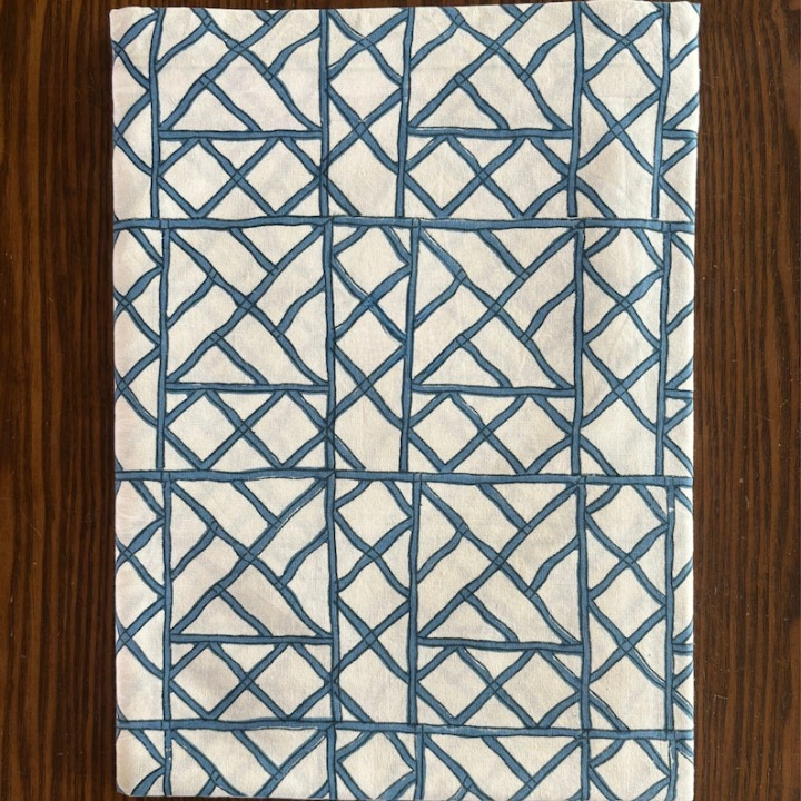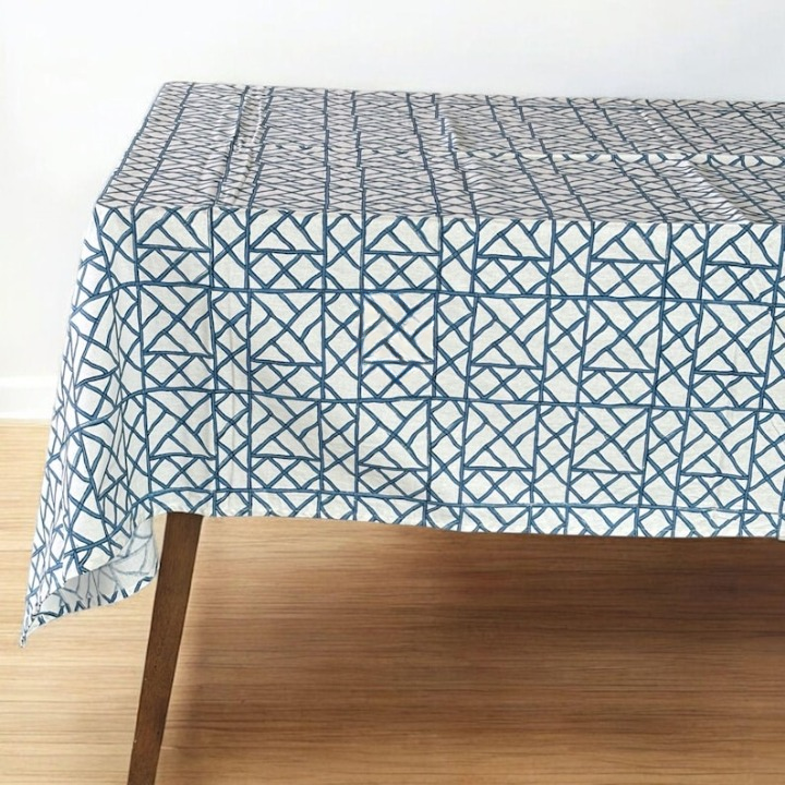 Nappe à motifs géométriques bleu et blanc, motif losanges avec bordure florale, nappe indienne bleue imprimée à la main