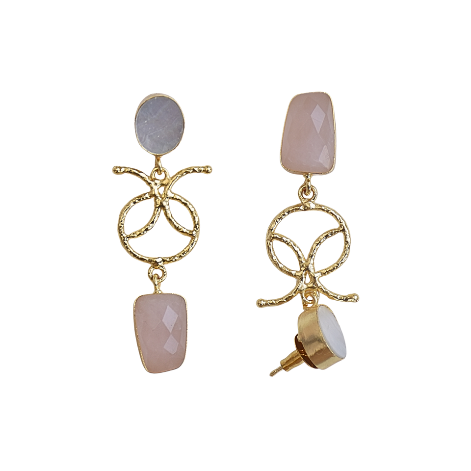 Boucles d'oreilles pendantes de créateur en or plaqué or, avec pierres semi-précieuses en quartz rose et nacre, au design géométrique sculptural