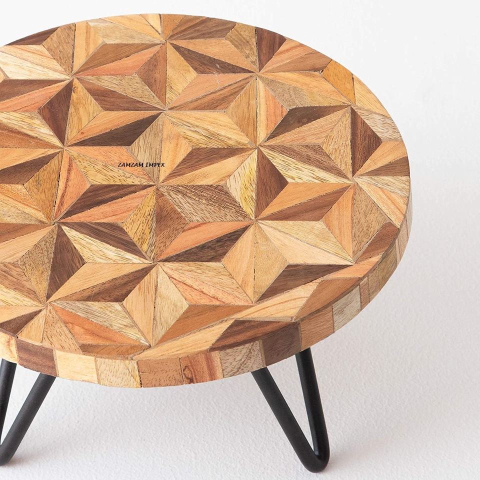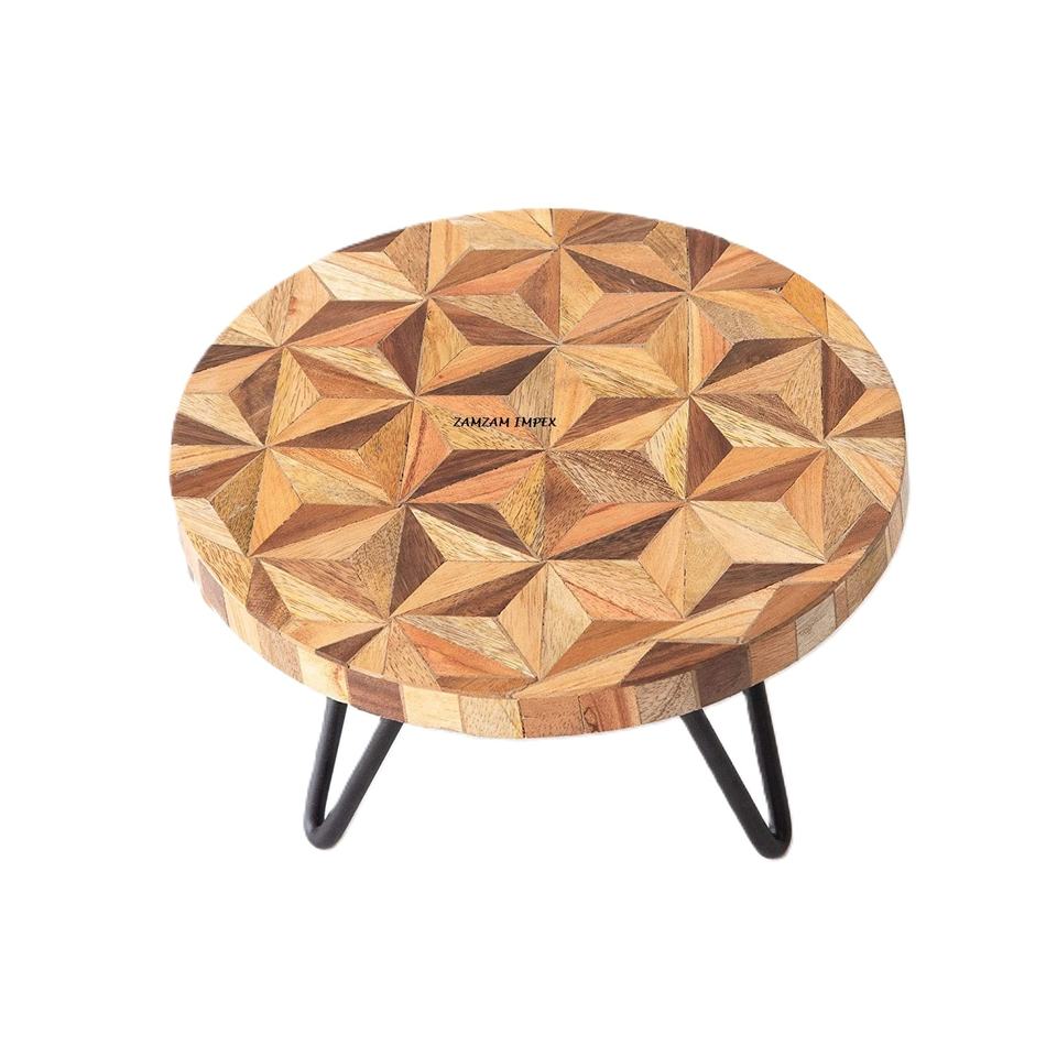 Support à gâteau multi-usage avec incrustation géométrique en bois, présentoir à jardinière ou petit tabouret en bois avec pieds en métal durable