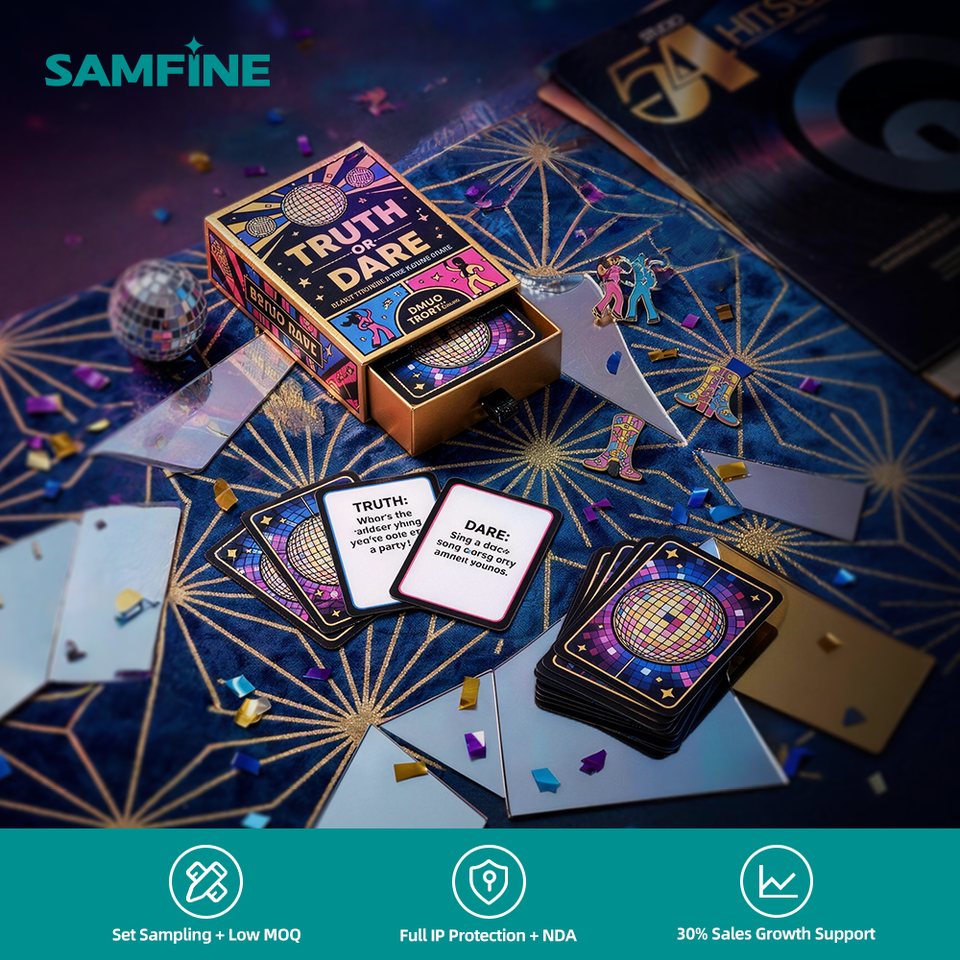 Presse allemande Heidelberg 8 couleurs avec vernis UV sélectif CPSIA – Impression personnalisée ludique pour cartes de vérité ou de défi pour le camping en plein air