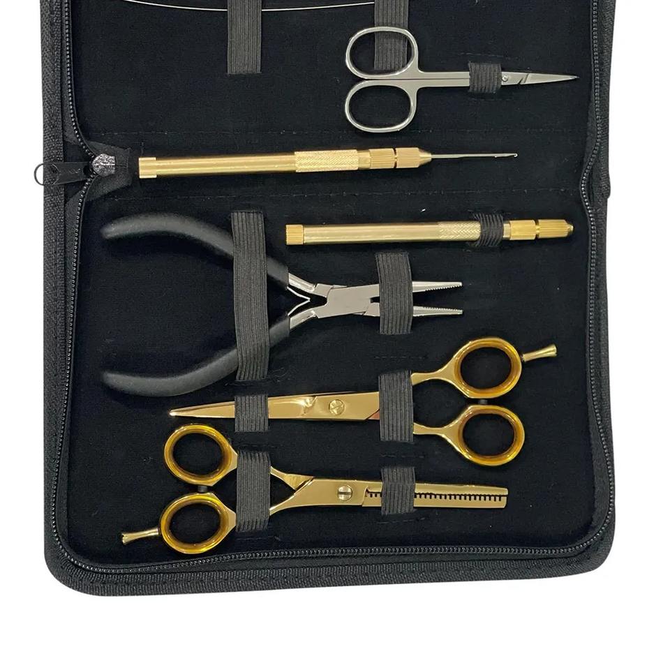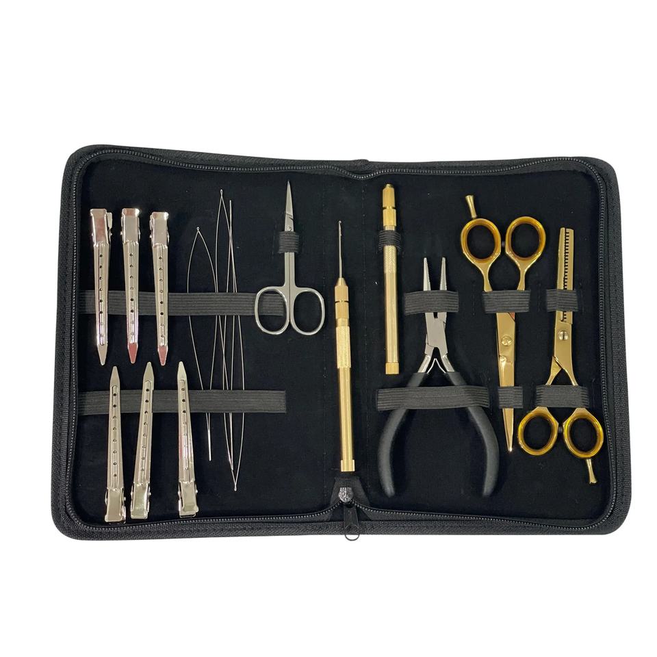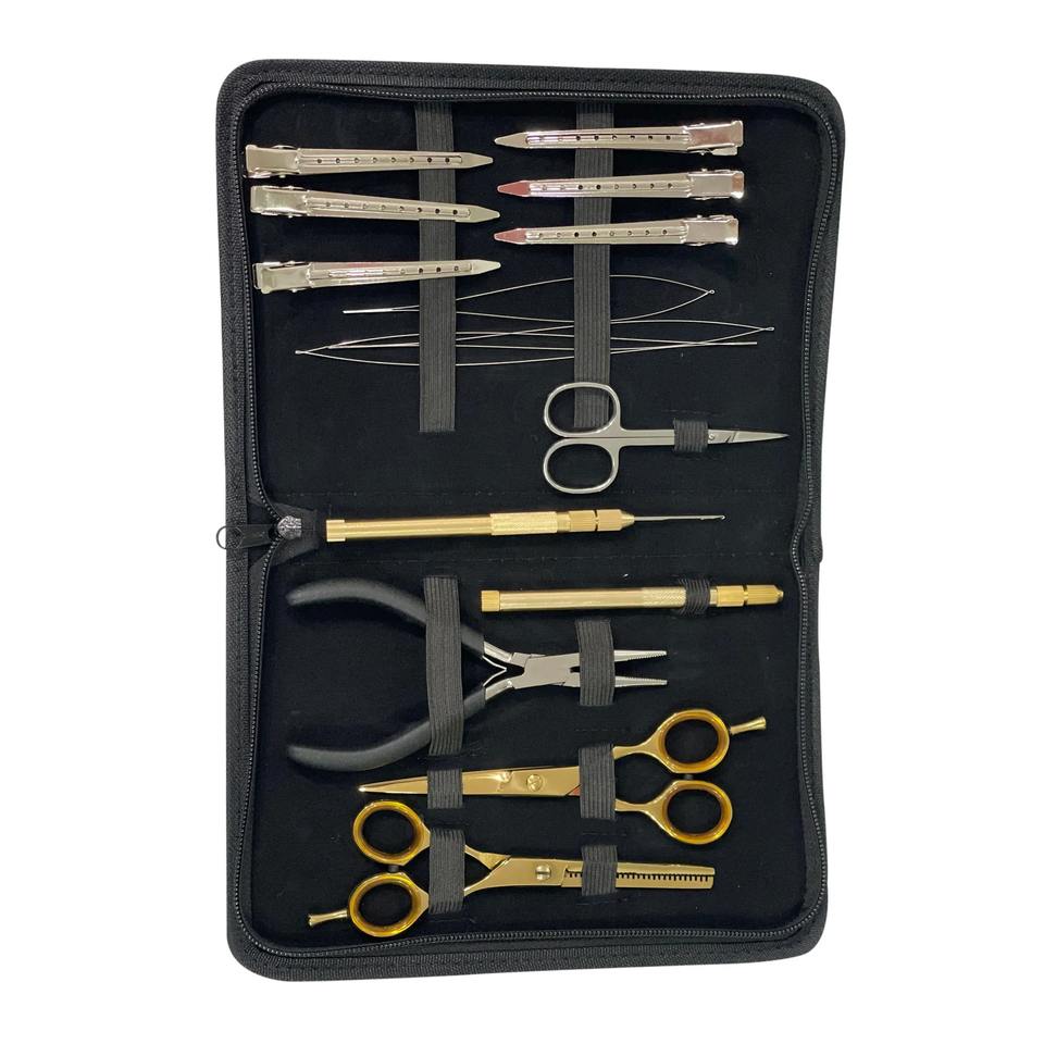 Kit d'outils d'extension de cheveux plaqué or sac emballé kit complet de pinces d'extension de cheveux avec boucles de clips et ciseaux de cisaillement et aiguille