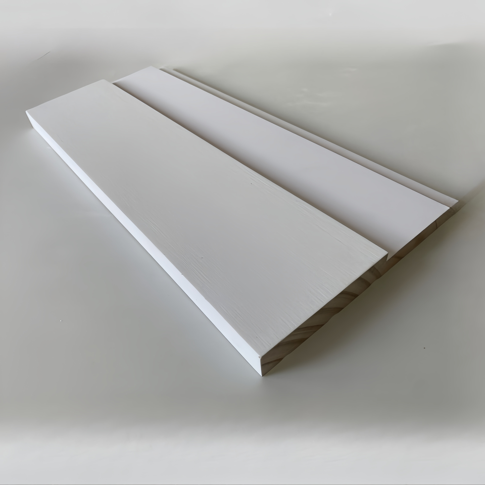 Plinthes et architraves en pin FJ à joints de doigt, apprêtées blanc
