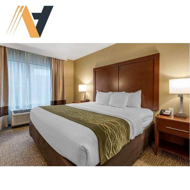 Obtenez un design d'intérieur de chambre à coucher, meubles en bois de haute qualité. Projet d'intérieur pour l'hôtel Confort Inn.