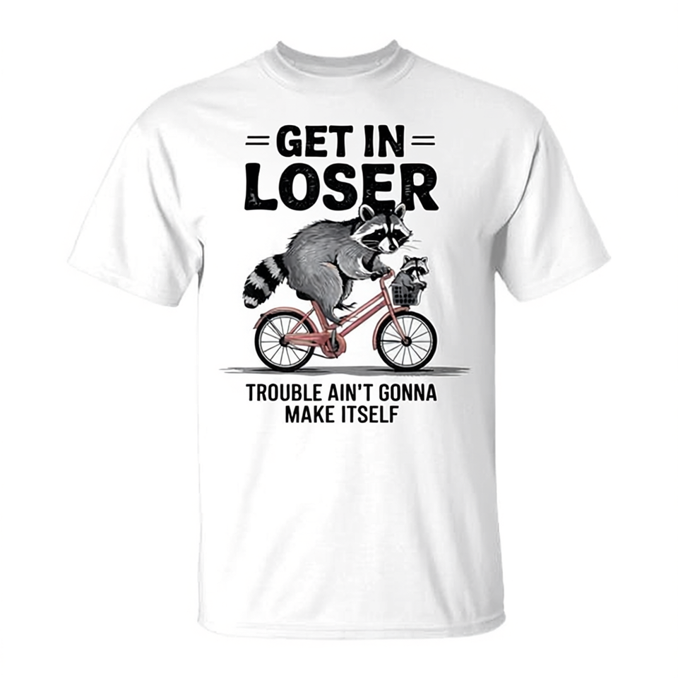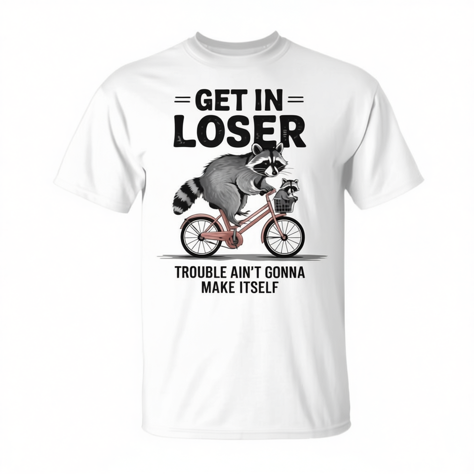 T-shirt promotionnel unisexe pour adulte à col rond et manches courtes, motif animal amusant 'Get In Loser Raccoon Bike'