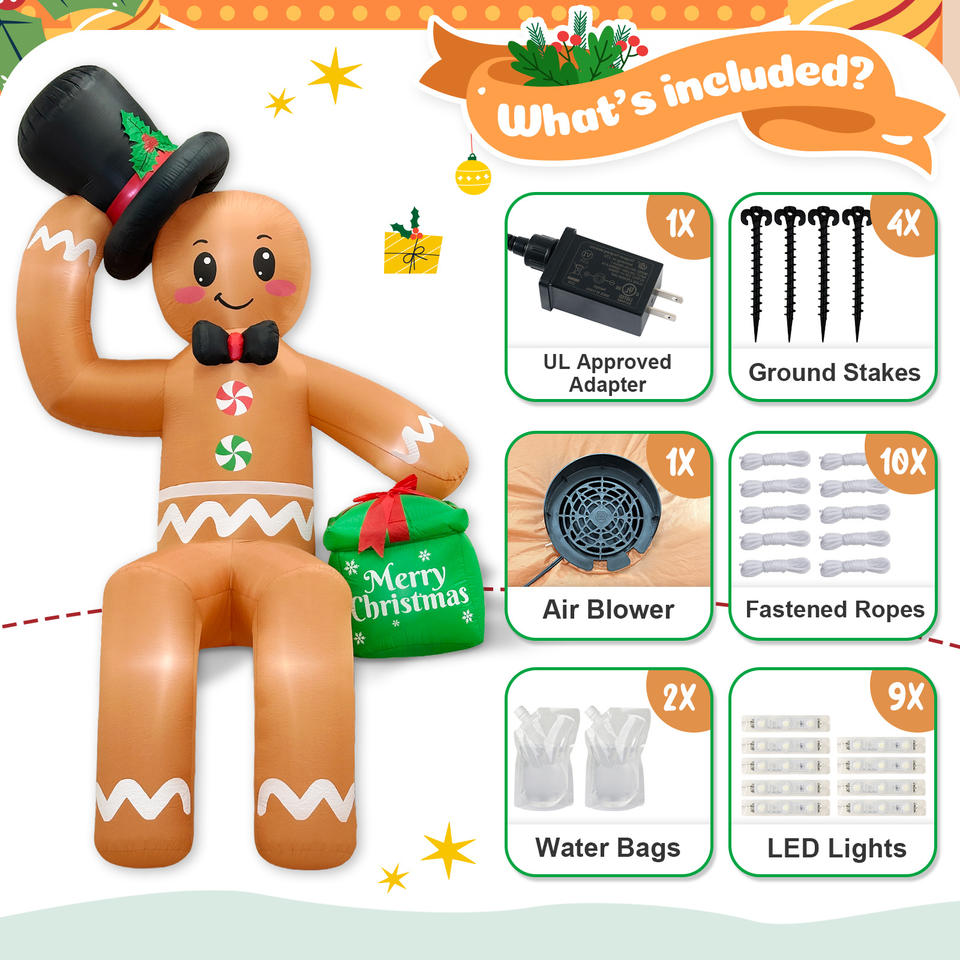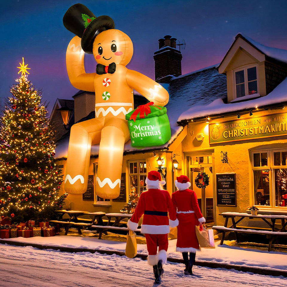 Homme en pain d'épices gonflable géant de Noël avec chapeau haut et sac cadeau, décoration de jardin extérieure, homme en pain d'épices gonflable éclairé par LED