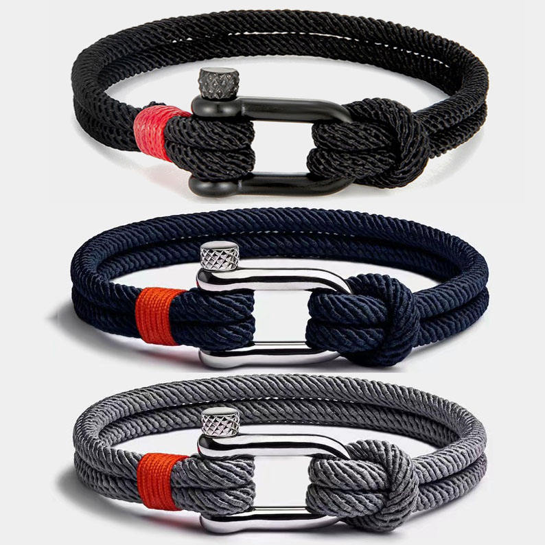 Bracelet de Survie Sportif d'Extérieur Nautique Double Rang en Corde Milanaise pour Homme, Acier Inoxydable, Manille en U, Tressé, Idéal Cadeau