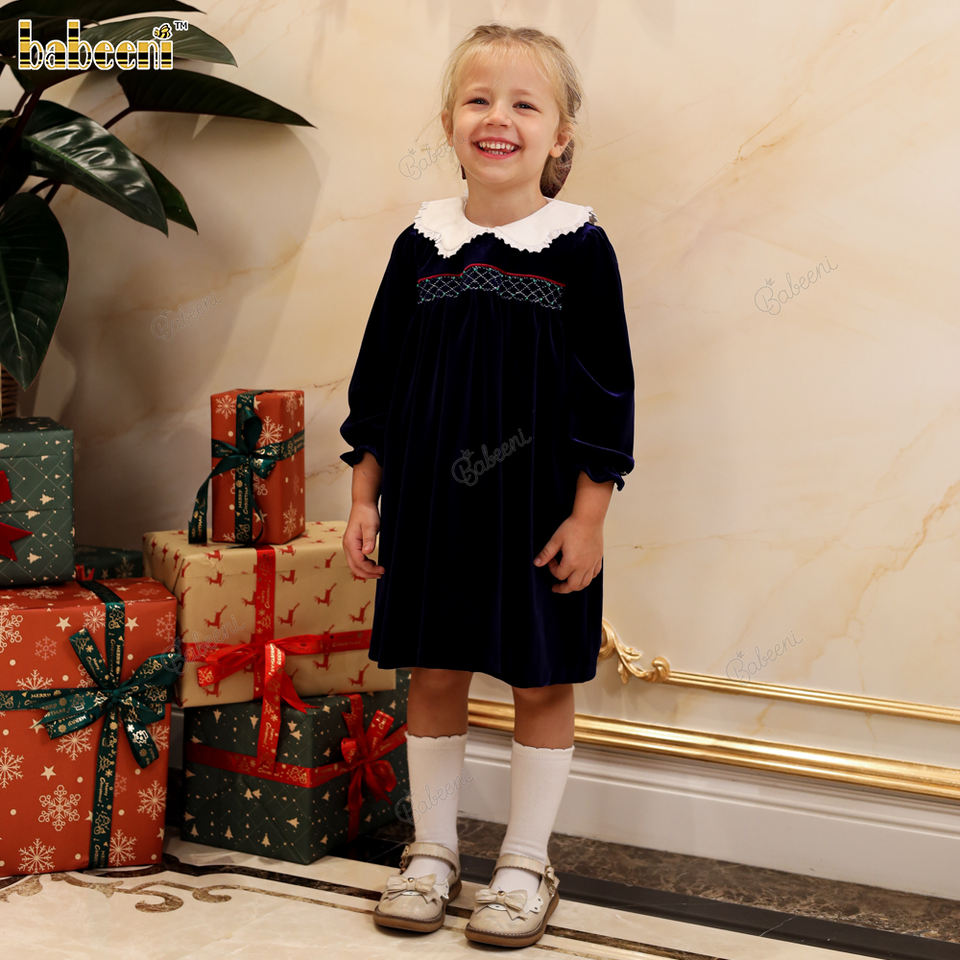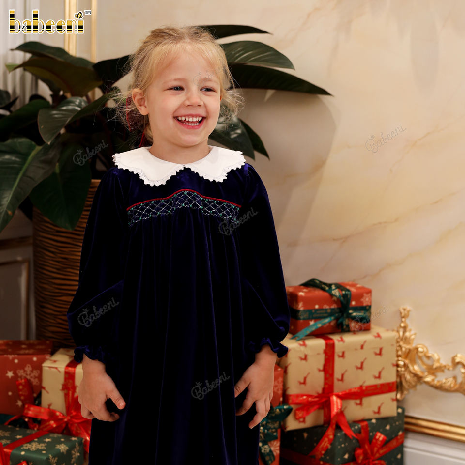 Girls' Dark Purple Velvet Holiday Dress with Petal Collar and Beaded Smocking ODM wholesale smocked dress for girl - DR4307