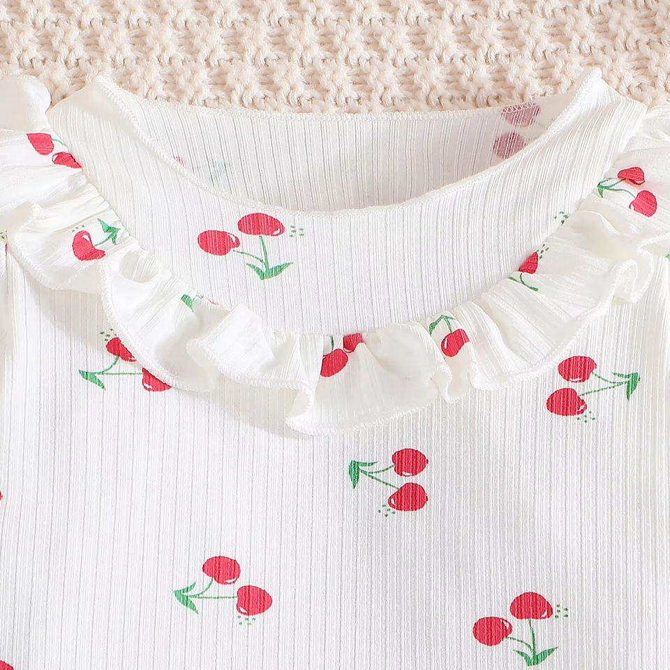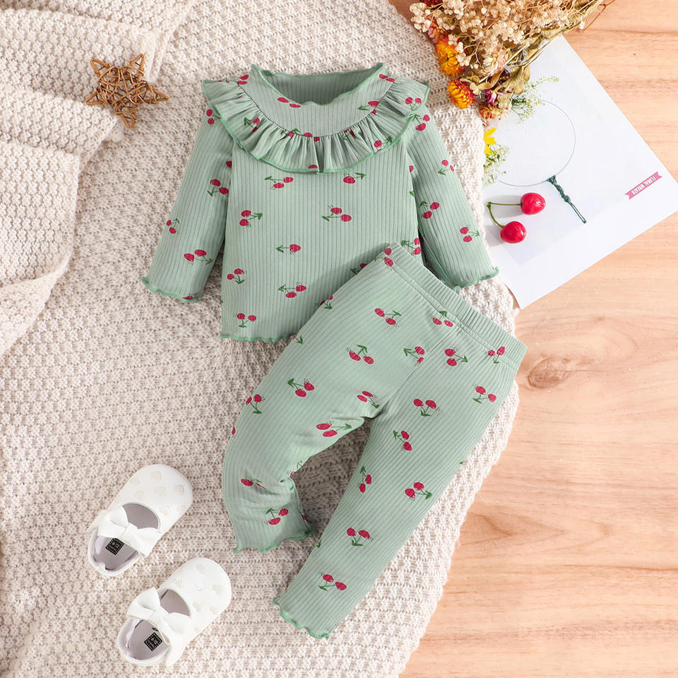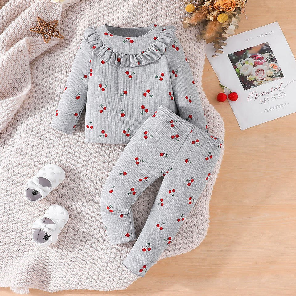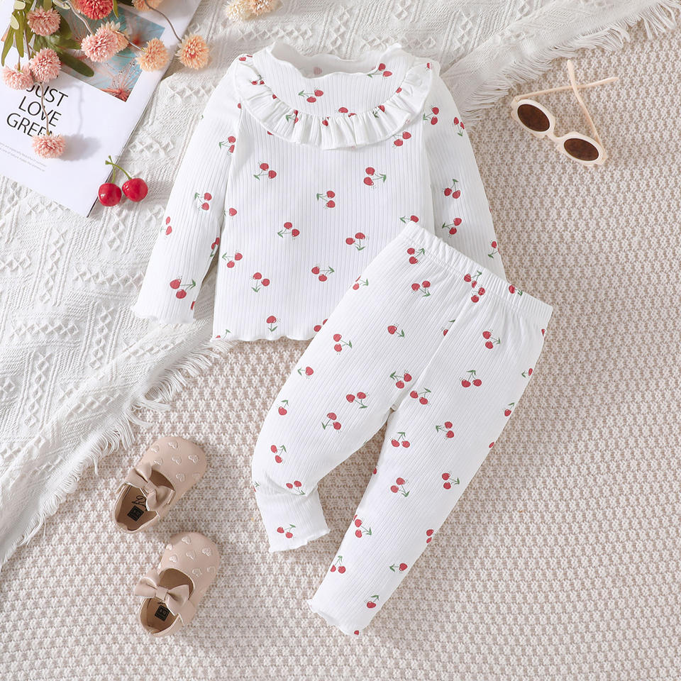 Ensemble décontracté deux pièces pour bébé fille, printemps-automne, tissu en spandex/polyester, haut à manches longues à rayures, pantalon à imprimé cerise