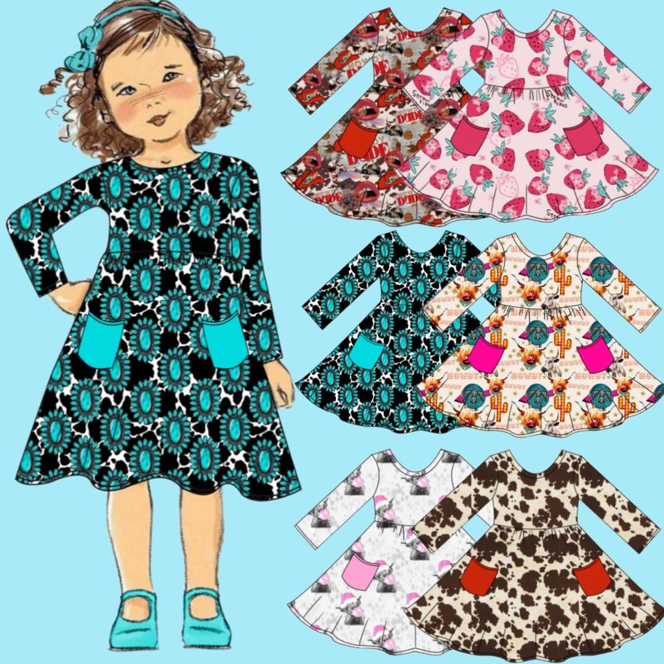 Robe t-shirt à manches longues pour filles printemps automne imprimés personnalisés vaches fraise balançoire robes décontractées avec poches 3-14 ans