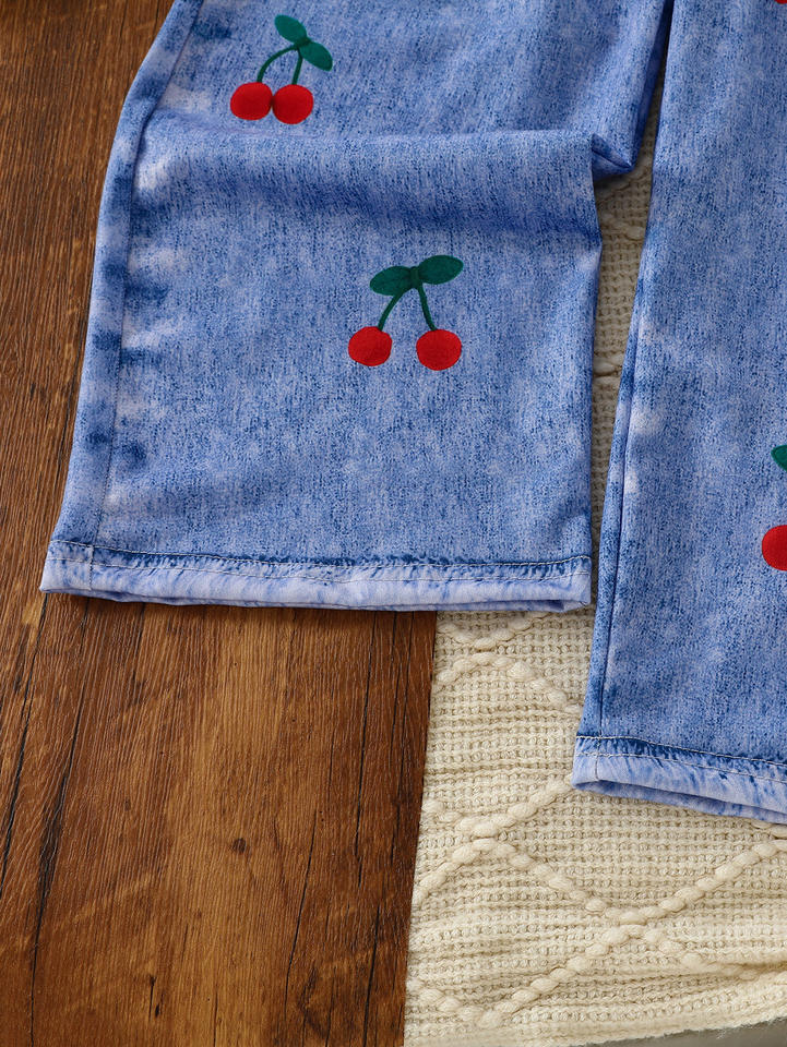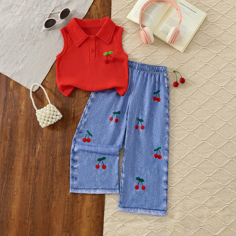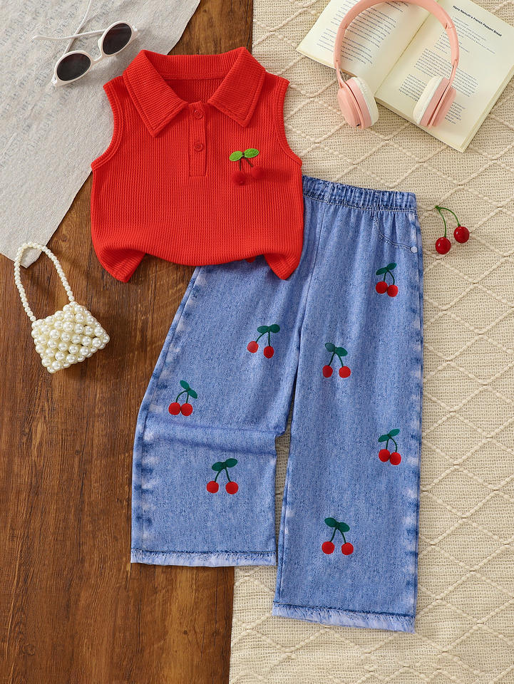 Girls' Summer Cherry Two-Piece Set Soft Sleeveless Pullover Top Faux Denim Pants Cartoon Print Cute Casual Outfit for Girls