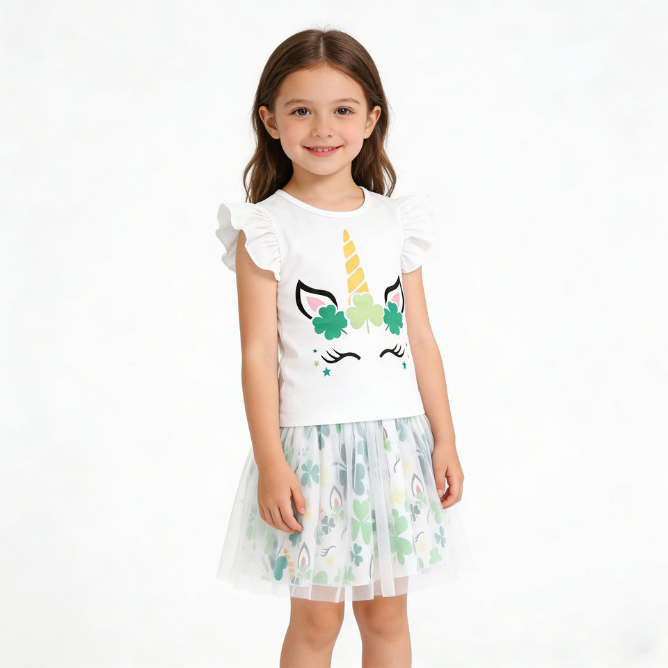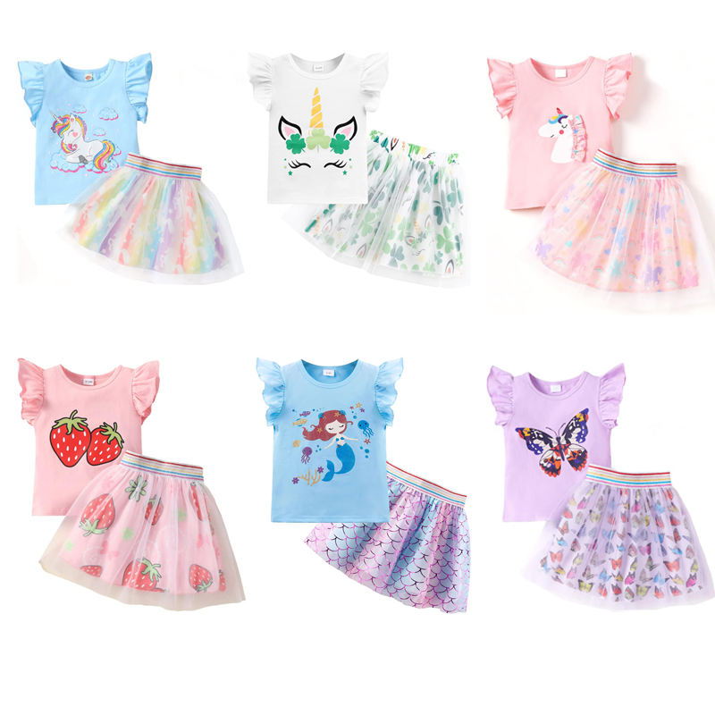 Ensemble jupe en tulle pour filles, deux pièces, t-shirt licorne à manches bouffantes, robe tutu, tenue de fête d'anniversaire d'été, 2-10 ans