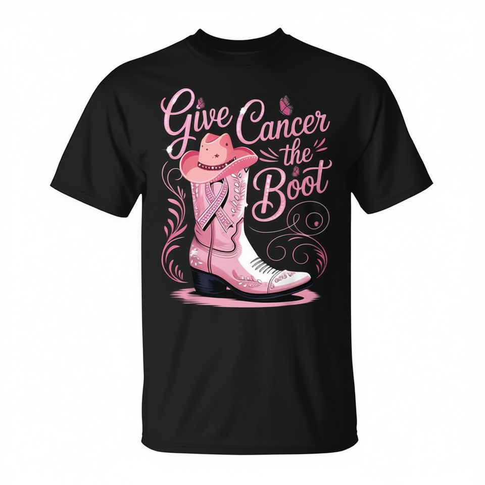 T-shirt Give Cancer The Boot avec bottes de cowboy roses pour la sensibilisation au cancer du sein