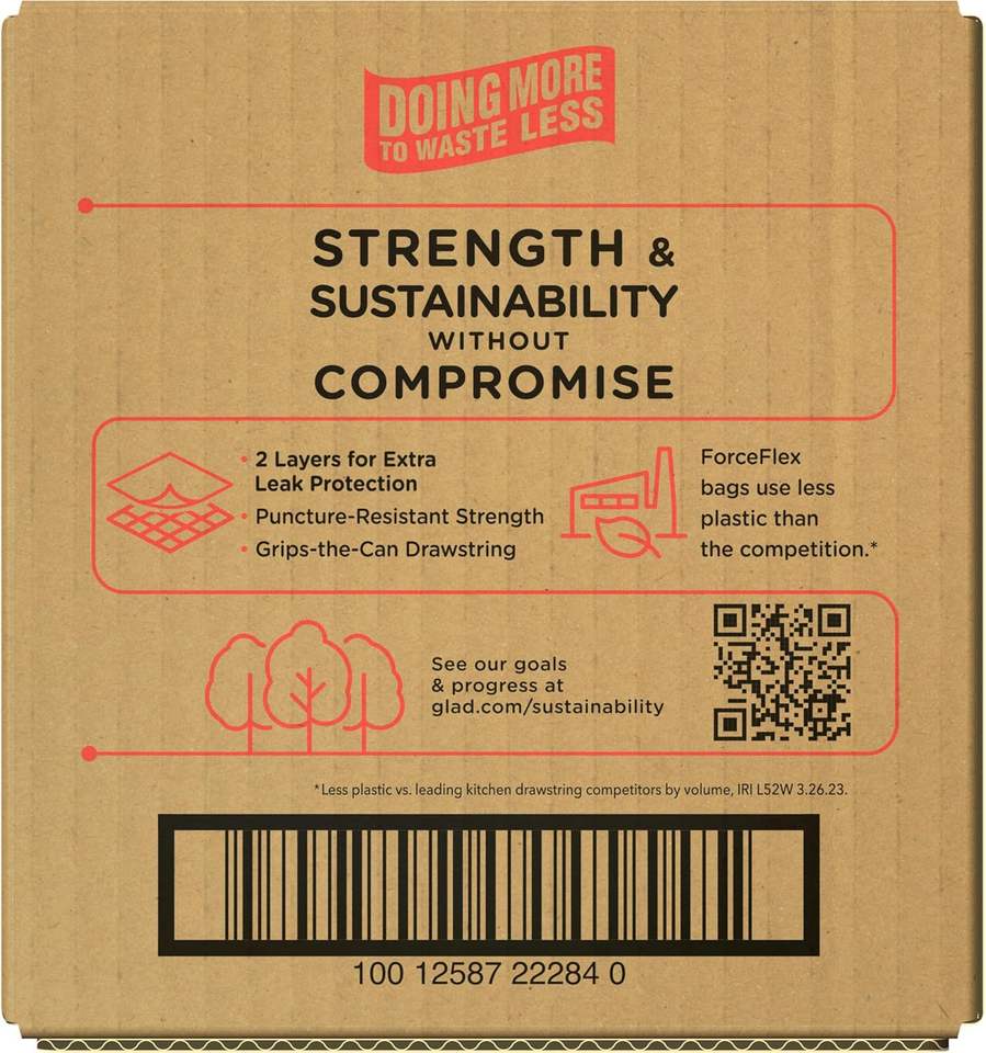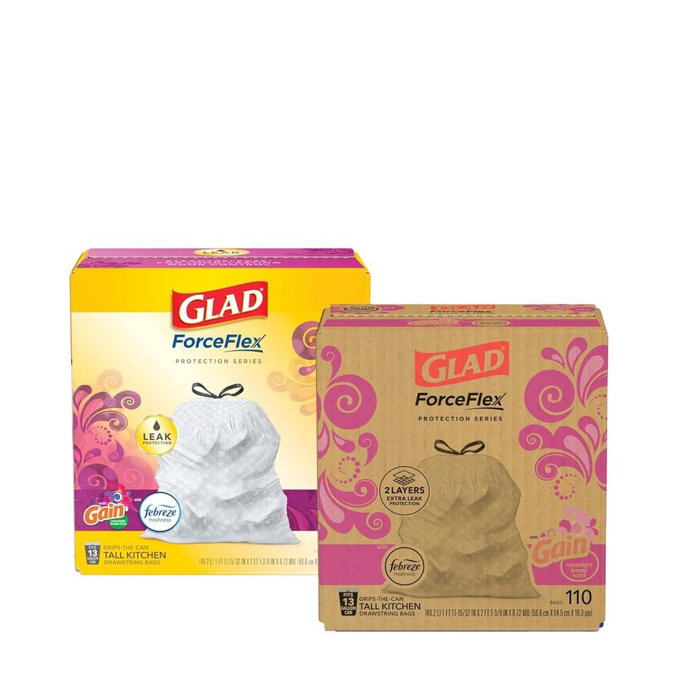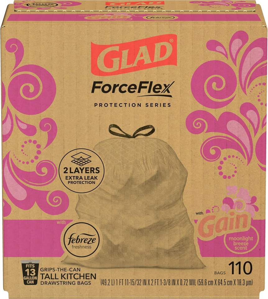 Sacs poubelle de cuisine Glad ForceFlex Tall, 13 gallons, parfum Gain Moonlight Breeze, 110 unités, le paquet peut varier