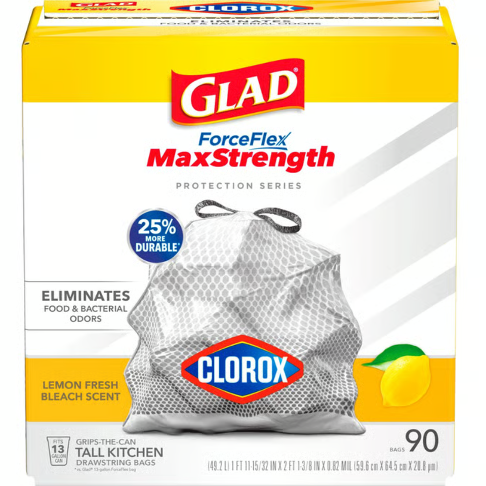 Sacs poubelle de cuisine Glad Tall 13 gallons MaxStrength Lemon Fresh Bleach biodégradables, grands, épais, avec cordon de serrage, 90 unités