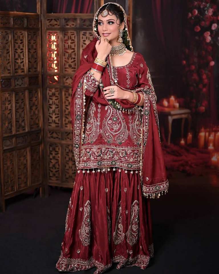 Ensemble Sharara glamour entièrement cousu avec haut fantaisie et Dupatta avec broderie lourde pour les mariages et les fêtes culturelles