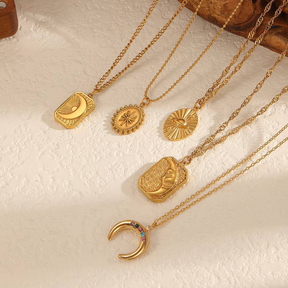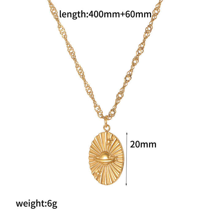 Colliers de pendentifs ovales en relief de planète Sunburst teints d'or d'inspiration rétro cosmique glamour imperméable à l'eau