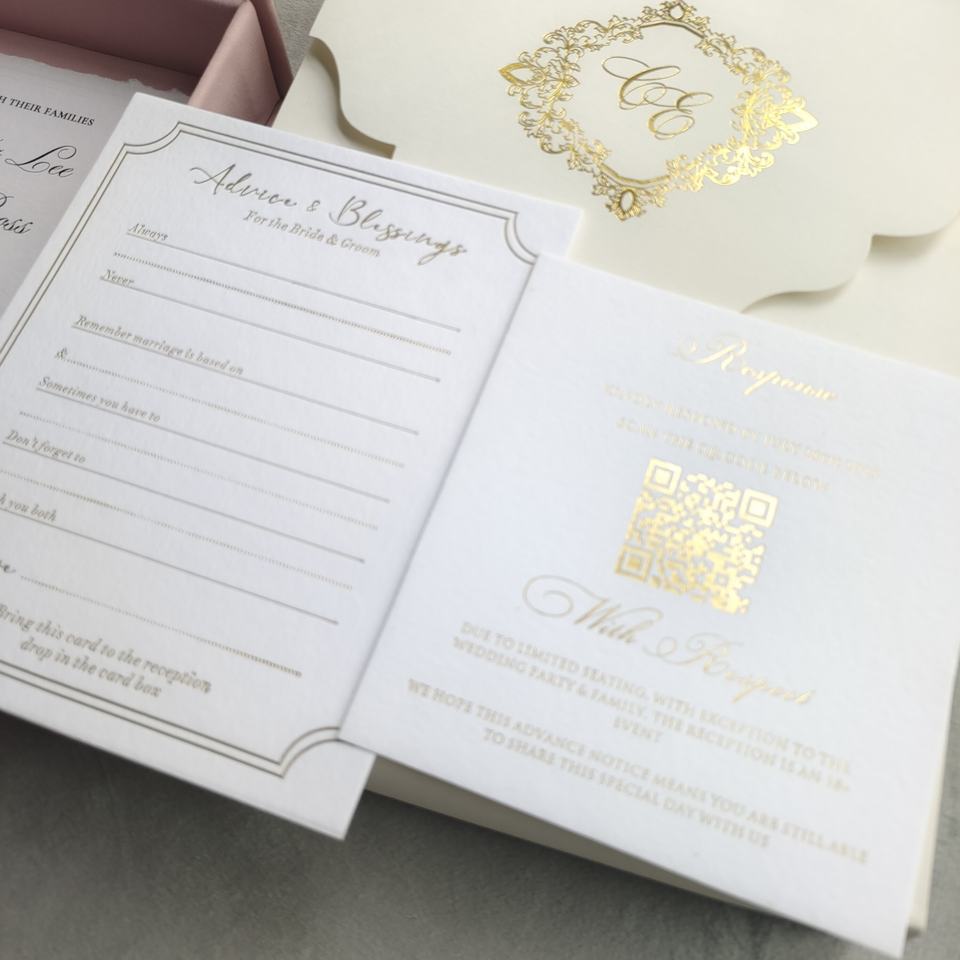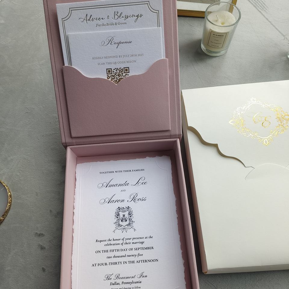 Inclure:Boîte en velours + Enveloppe + Carte en papier + Cartes de réponse (RSVP) + Carte de détails