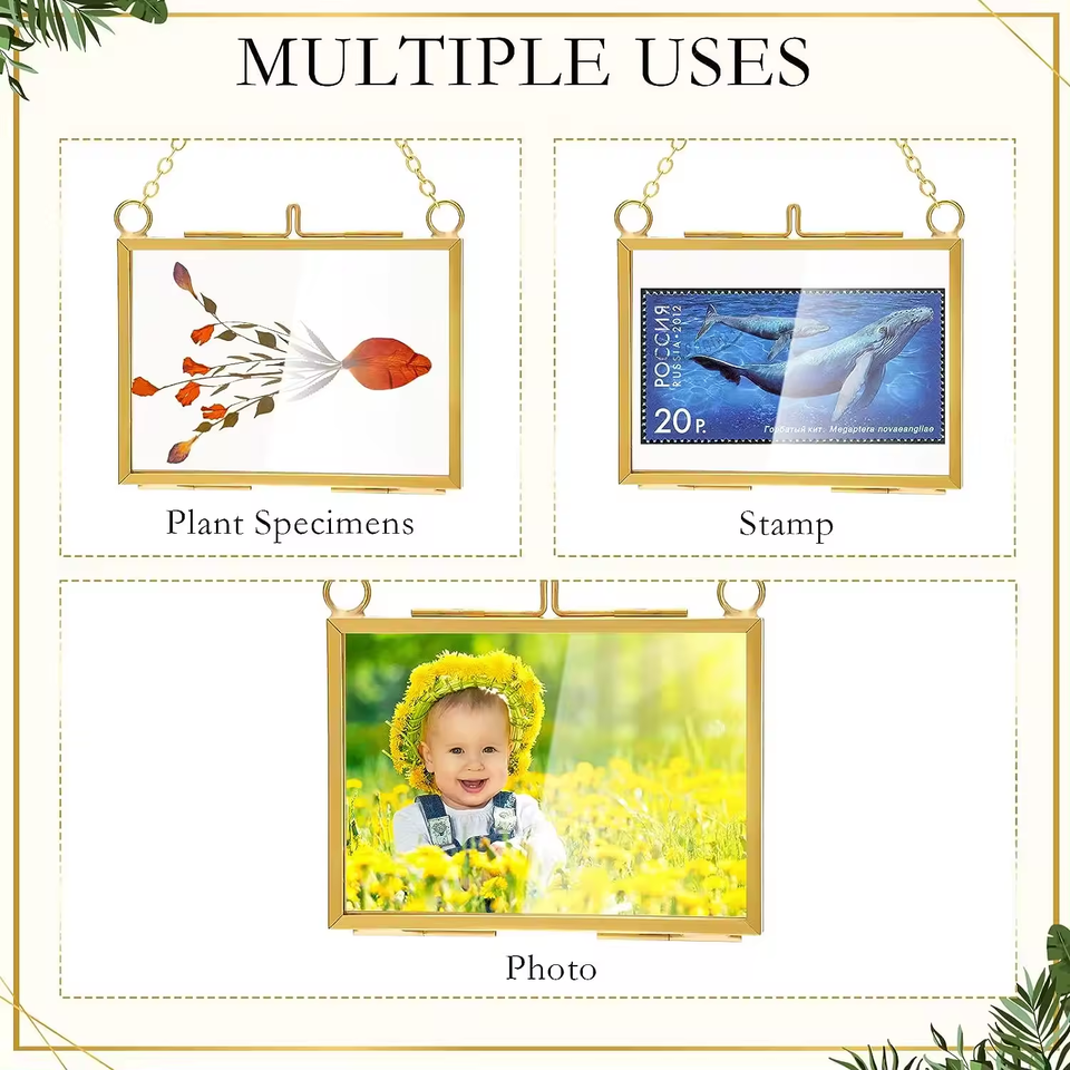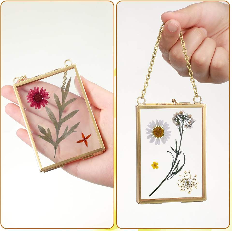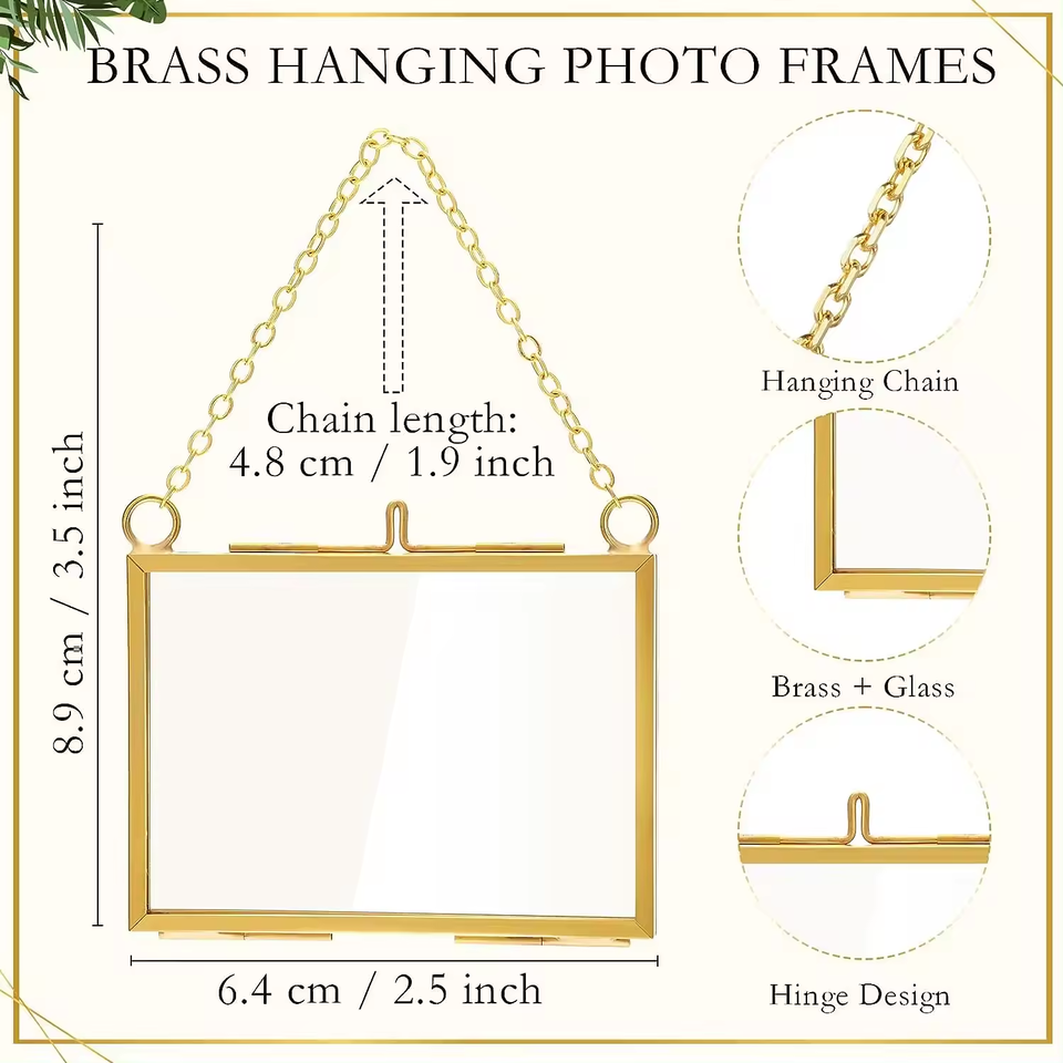 Cadres photo flottants doubles en laiton avec chaîne, pour fleurs pressées en verre, 3,5 x 2,5 pouces, décoration murale