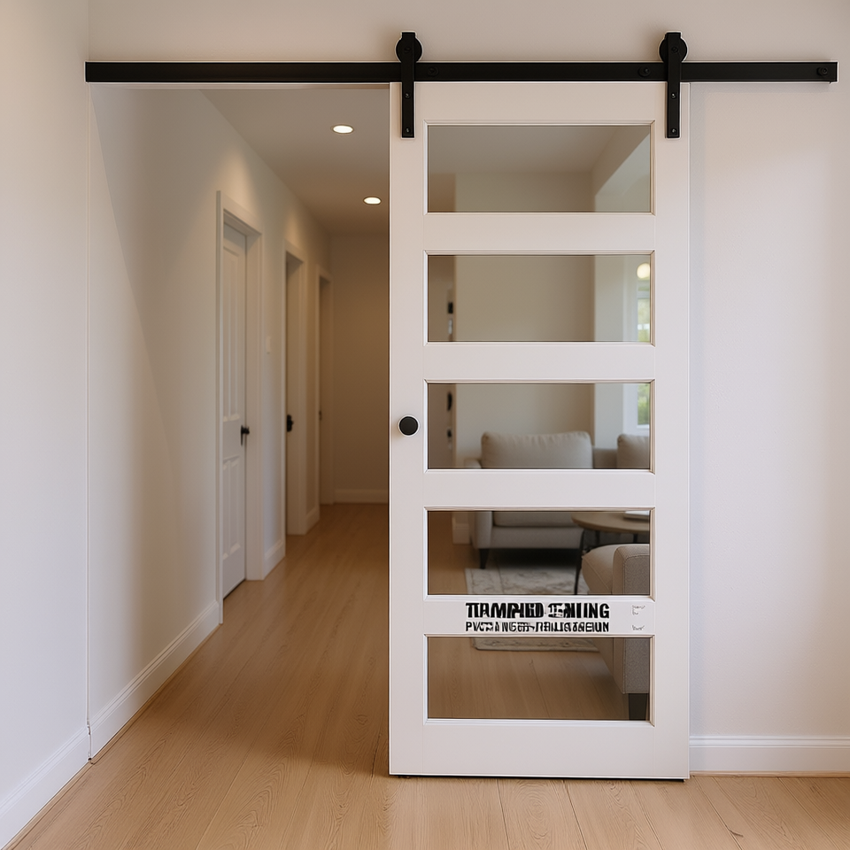 Porte coulissante en verre 36 po x 84 po, verre trempé dépoli, style ferme, fonctionnement manuel, revêtement PVC étanche