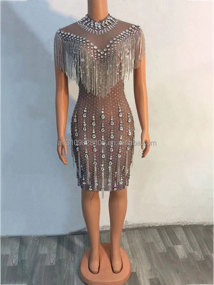 Déguisement scintillant sexy, en argent, décolleté plongeant en V, strass, extensible, bar, discothèque, chanteur, danse, compétition de danse moderne, avec pompon