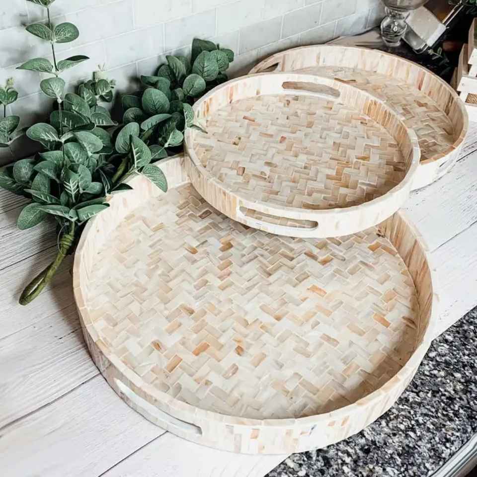Plateau de service et de rangement moderne et arrondi, finition brillante, fait main, en résine et incrustations de nacre, idéal pour mariages, Ramadan, Aïd et autres occasions festives