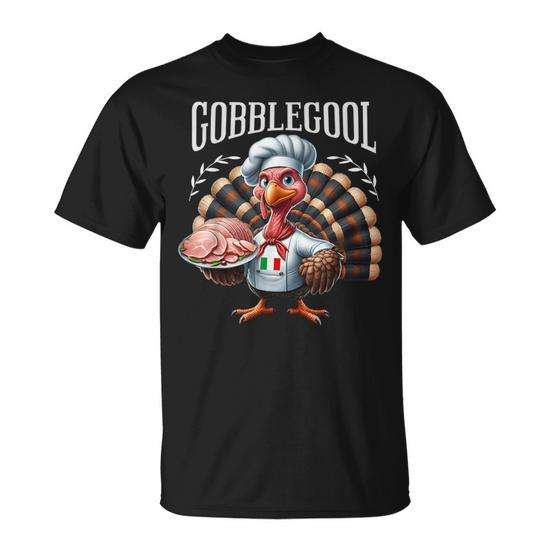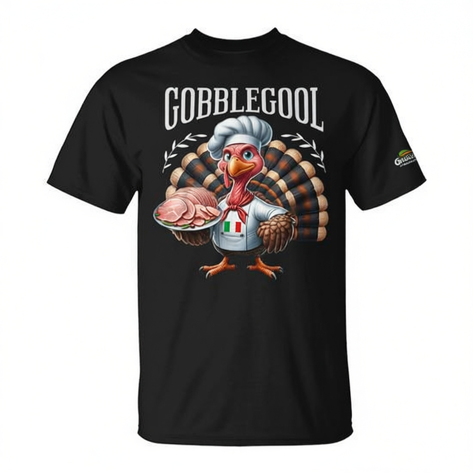 Gobblegool Turkey Chef T-shirt noir à manches courtes pour adulte, style rétro, dessin animé, Thanksgiving