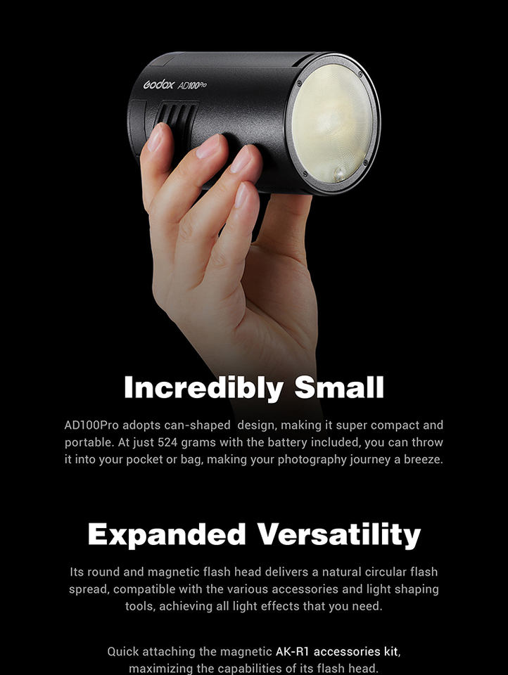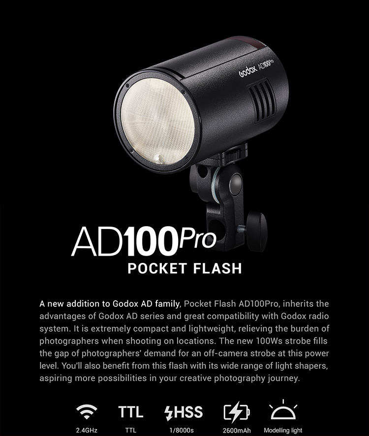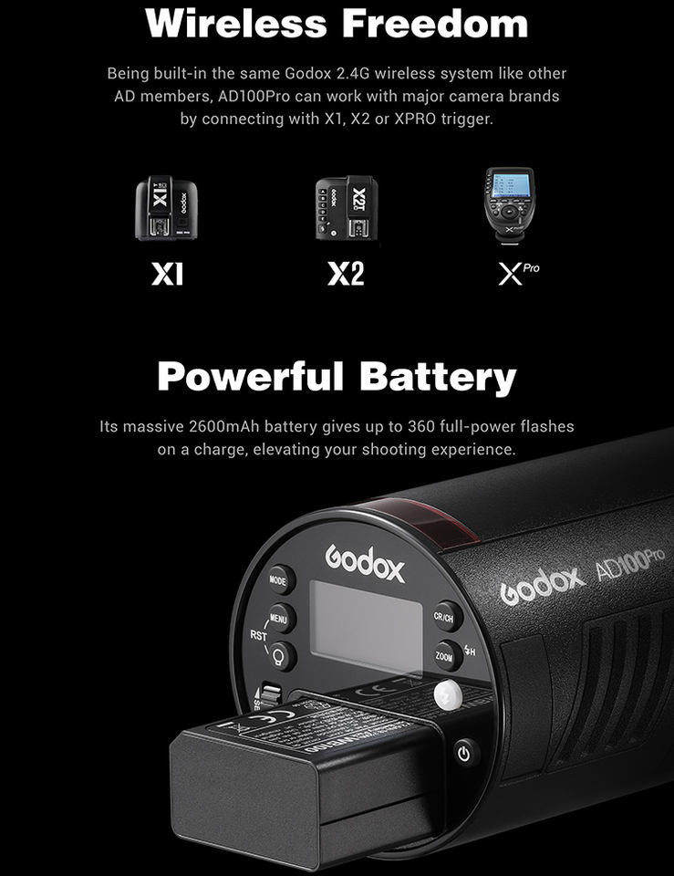 Godox AD100Pro AD100 Pro, flash stroboscopique 100Ws 2.4G avec batterie au lithium 7.2V/2600mAh 360 flashs pleine puissance 0.01-1.5s