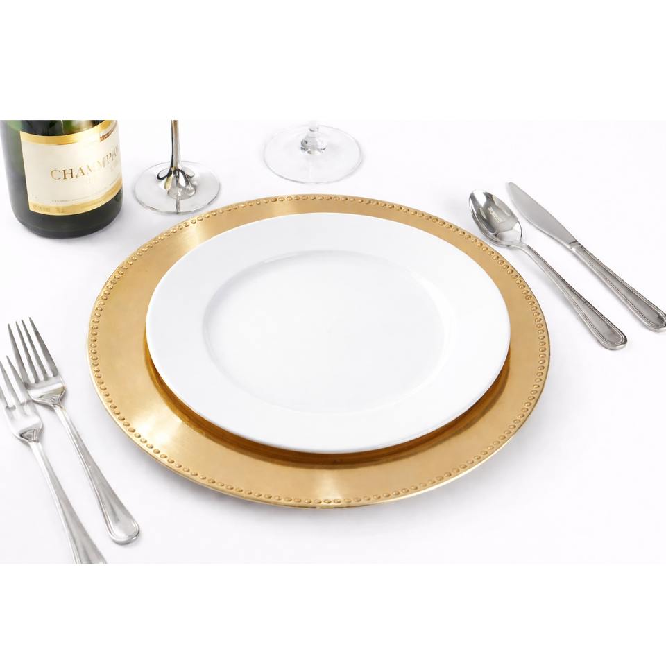Assiette de service décorative haut de gamme à bordure perlée dorée pour hôtels de luxe, réceptions et célébrations gastronomiques