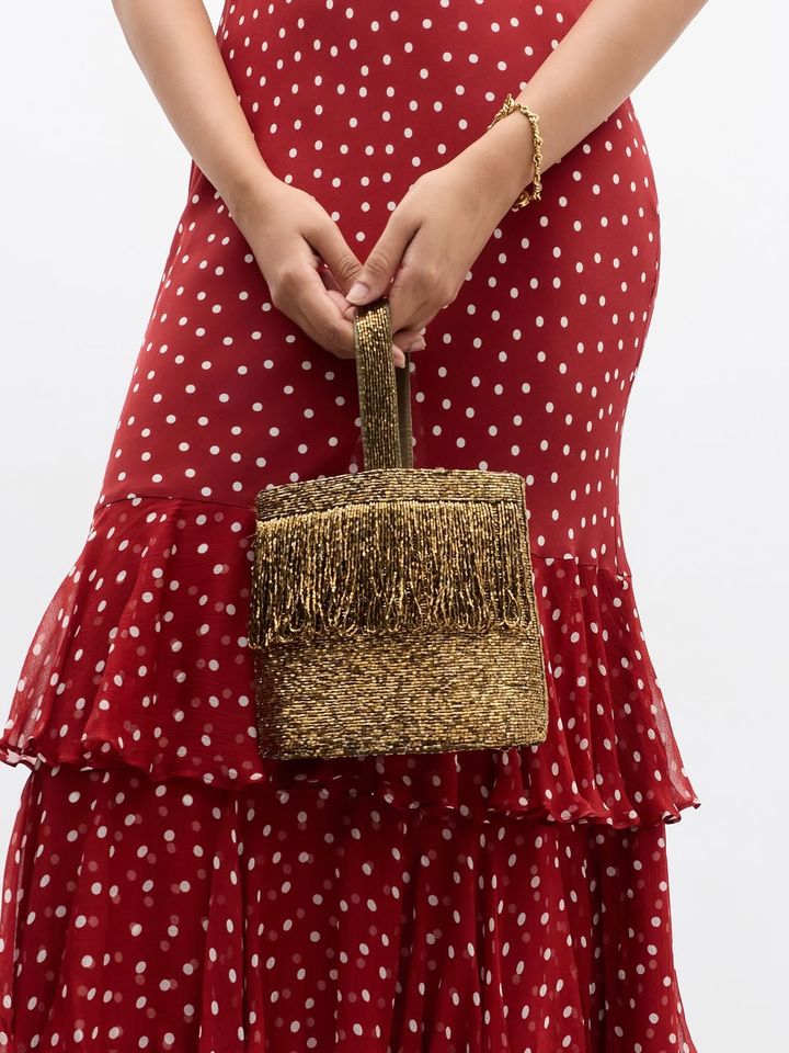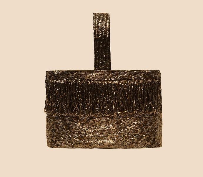 Sac à main doré perlé avec poignée supérieure, design à franges, sac de transport tendance pour femme, style fourre-tout structuré, accessoire de soirée