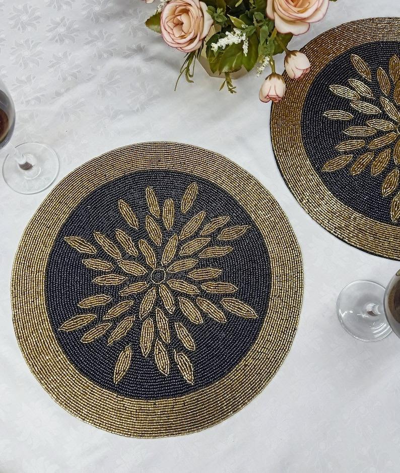 Sous-plat rond unique en cristal doré et perles de verre Sous-plat rond unique en cristal doré et perles de verre