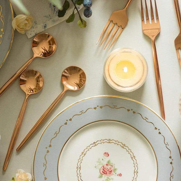 Ensemble de couverts en acier inoxydable doré de haute qualité, écologique, nouveau design pour un usage domestique comprenant une assiette de cuillère à motif de fruits fantaisie