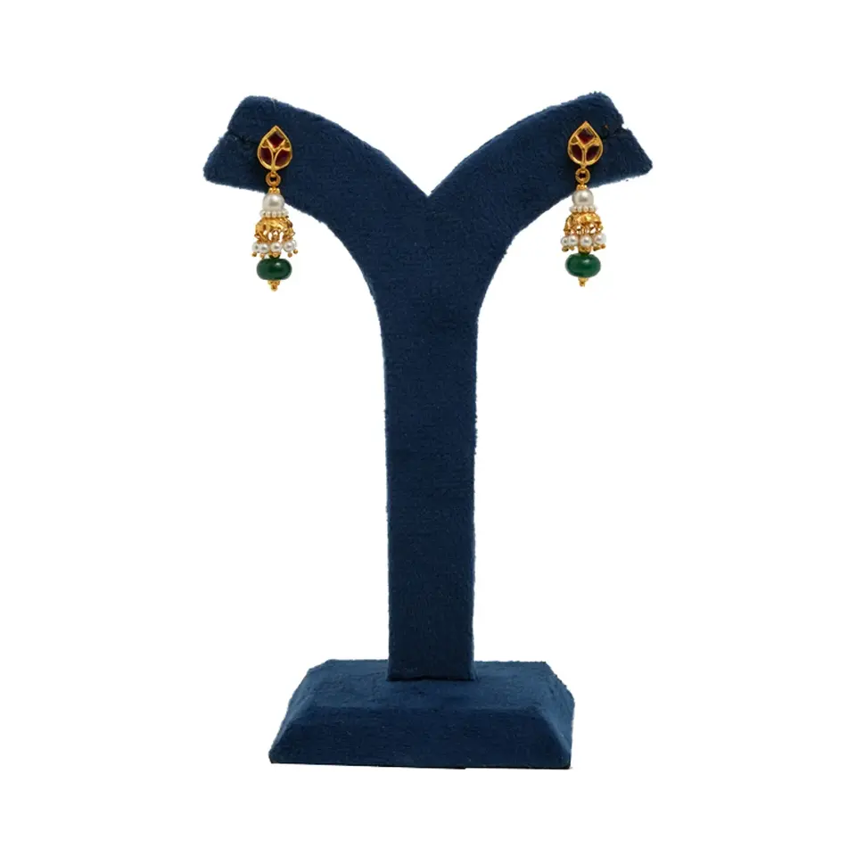 Ensemble de boucles d'oreilles en or avec des perles d'émeraude vertes, des détails floraux en émail rouge et des brins de perles blanches délicats