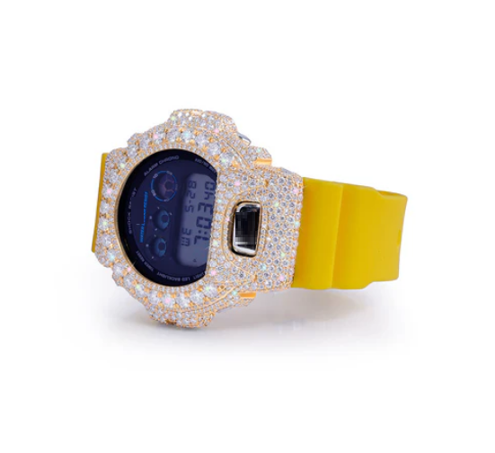 Montre à bracelet jaune doré avec lunette entièrement sertie de diamants, bracelet en acier inoxydable, boîtier rond, résistance à l'eau de 10 bars