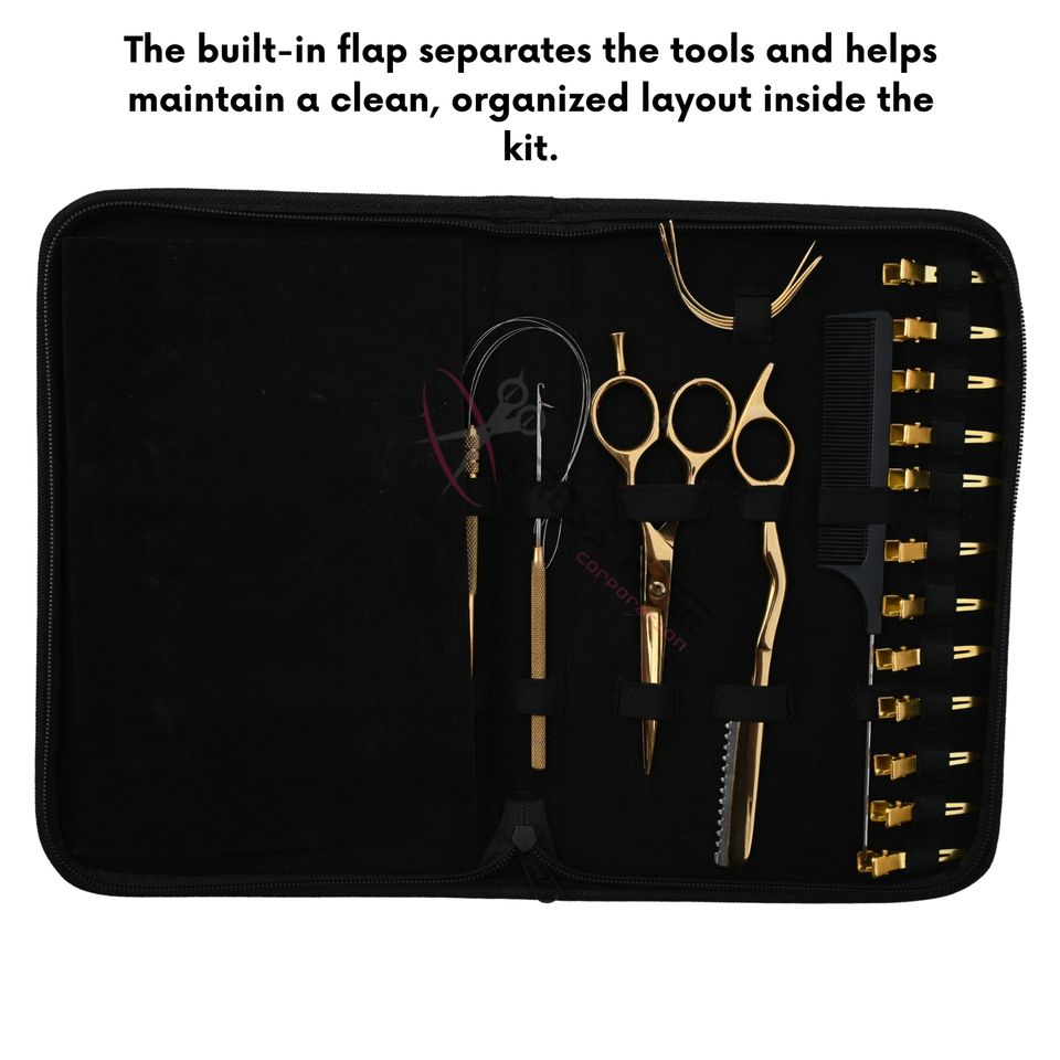 Nom du produit:Ensemble d'outils d'extensions capillaires dorés pour stylistes, mini-ciseaux et ciseaux de barbier