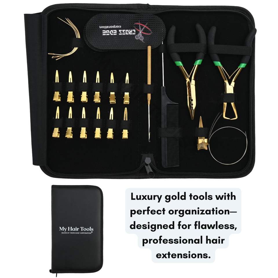 Kit d'outils pour extensions capillaires dorées avec pince à micro-anneaux, pince à ouvrir les perles, aiguilles courbées, bande Velcro pour cheveux, outil professionnel pour salon