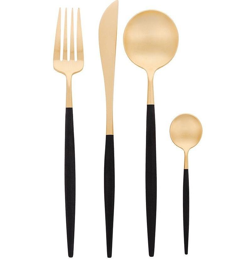 Ensemble de couverts en acier inoxydable à manche noir avec couteau, fourchette et cuillères et finition élégante