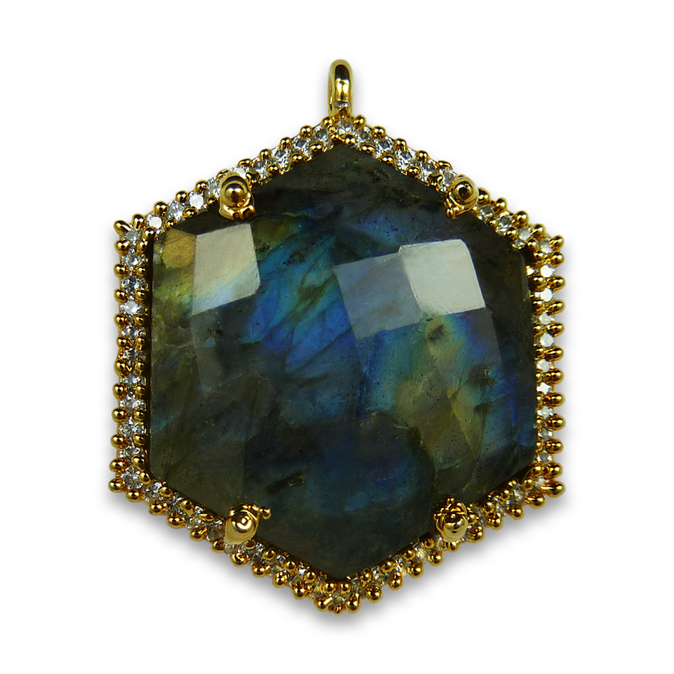 Pendentifs breloques en argent sterling avec pavé de labradorite grise hexagonale, sertis clos, plaqués or rhodié