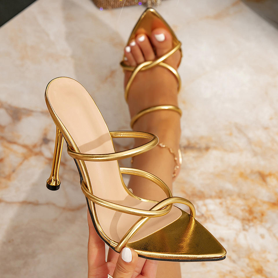 Sandales dorées à talons aiguilles, bout pointu, à larges brides, tendance mode, chaussures pour femmes, super hauteur 8 cm, à enfiler, toutes saisons