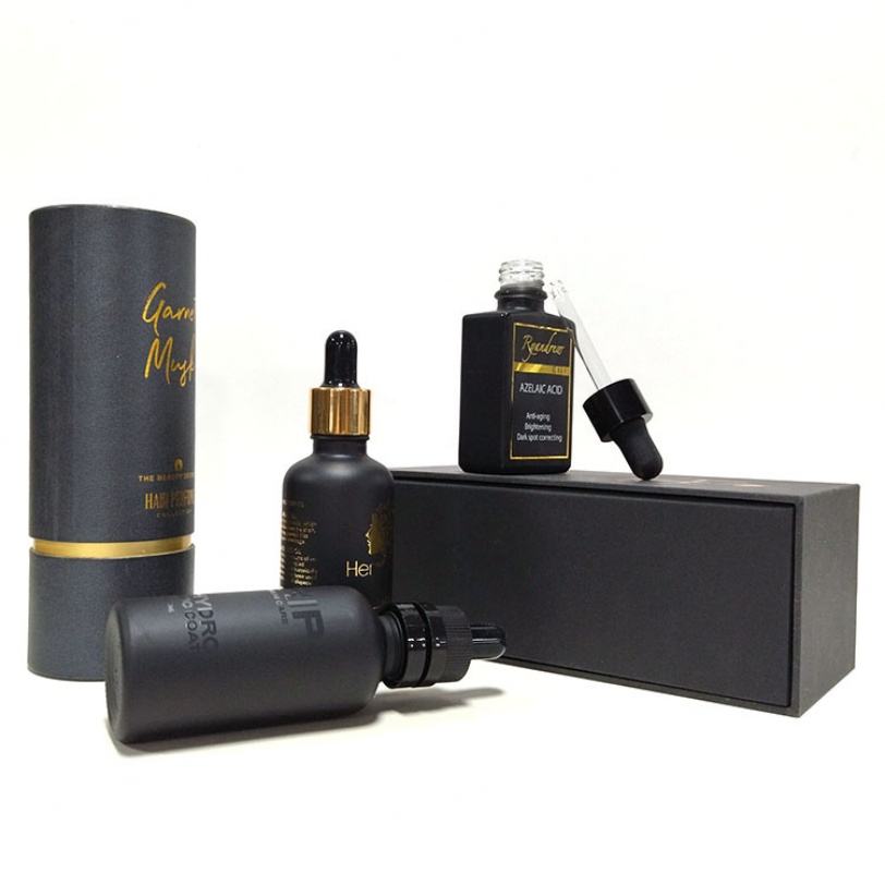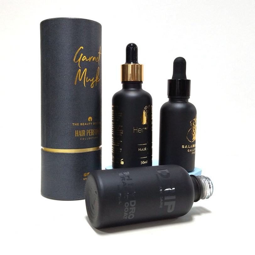 Gold Hot Stamping Custom clear Frosted Black Amber Cylinder Hair Oil Cosmetic Serum Glass Dropper Empty Bottle for Essential Oil