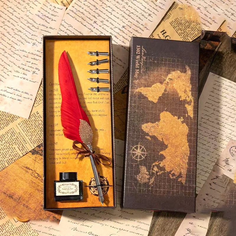 Accessoires:Stylo plume à plume, bouteille d'encre, cinq stylos plume en argent, boîte de rangement