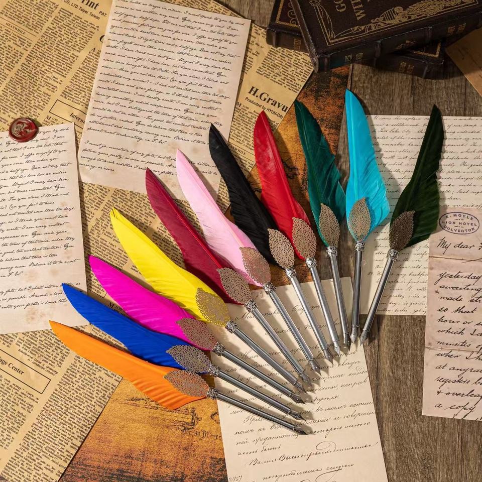 Ensemble de plume à plumes et de stylo à encre à plume avec feuille d'or, motif paon bleu, style rétro, tige argentée, ensemble de feuille d'or pour carte, stylo à encre à plume, ensemble de plume à plumes, cadeau pour les enseignants, boîte
