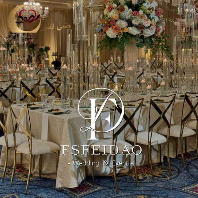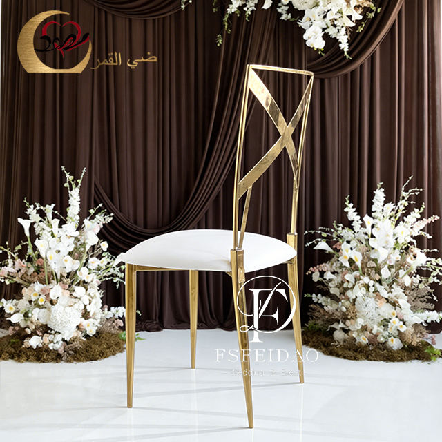 Chaises de salle à manger modernes empilables de luxe avec dossier en maille dorée et structure en acier inoxydable pour la maison, les événements, les mariages et les fêtes